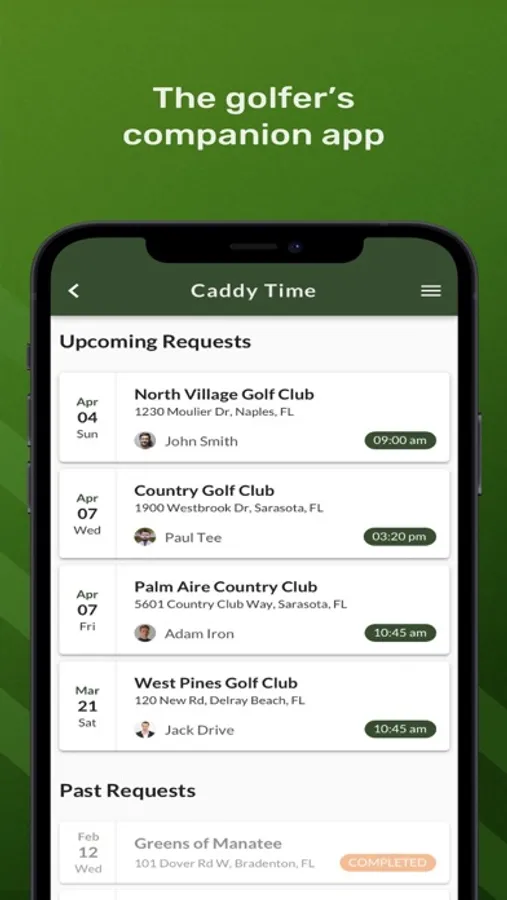 Introducing Caddy Time. The golfer’s companion app, connecting them to local professionals that are proven to enhance your next round. All it takes is one round with a caddie, and you’ll never want to play without one again. Whether it’s an upcoming tournament, a business deal in the making or just trying to improve your game, playing with a caddie is the best upgrade you can make to your next round. Leave the connection to us.
