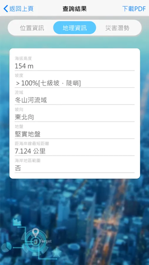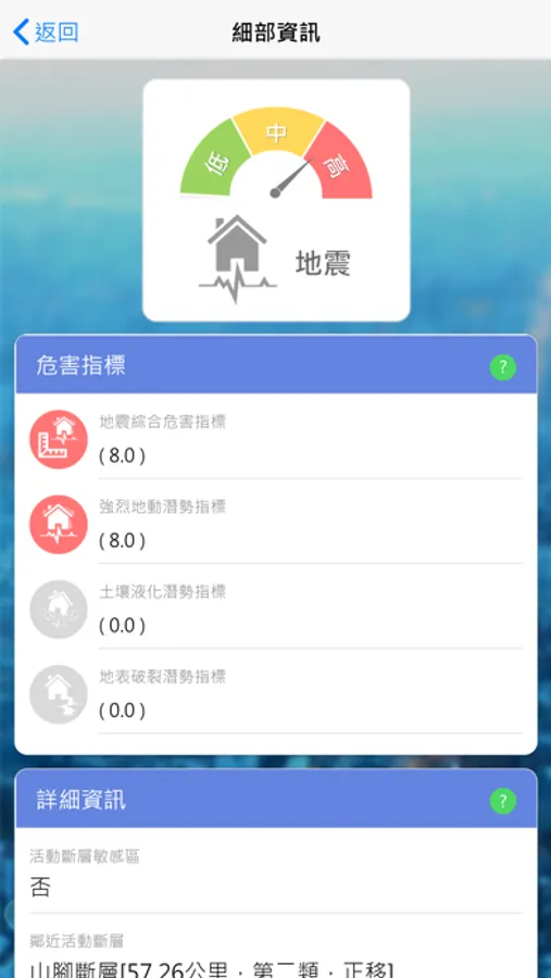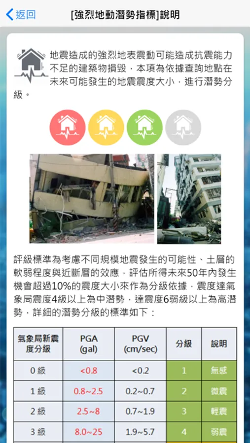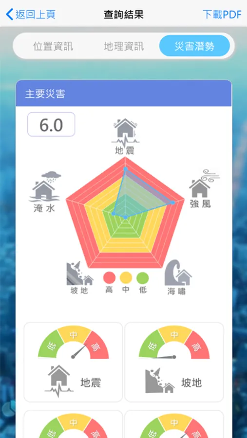 清楚、專業的項目說明與評分,包含了5個主要災害及3個次要災害,高達超過100種以上的風險項目,輕鬆取得如地震、坡地、淹水、強風、海嘯、地層下陷、雷擊、土壤汙染…等各項詳細說明資訊及其潛勢分數。