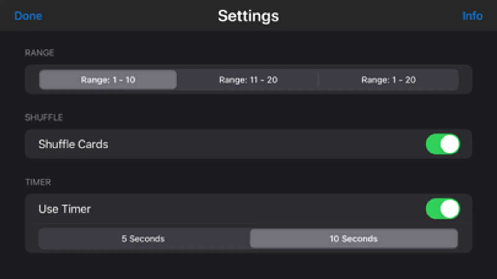 - selecting the number ranges for the flashcards; Range: 1 - 10, Range: 11 - 20, or Range: 1 - 20
