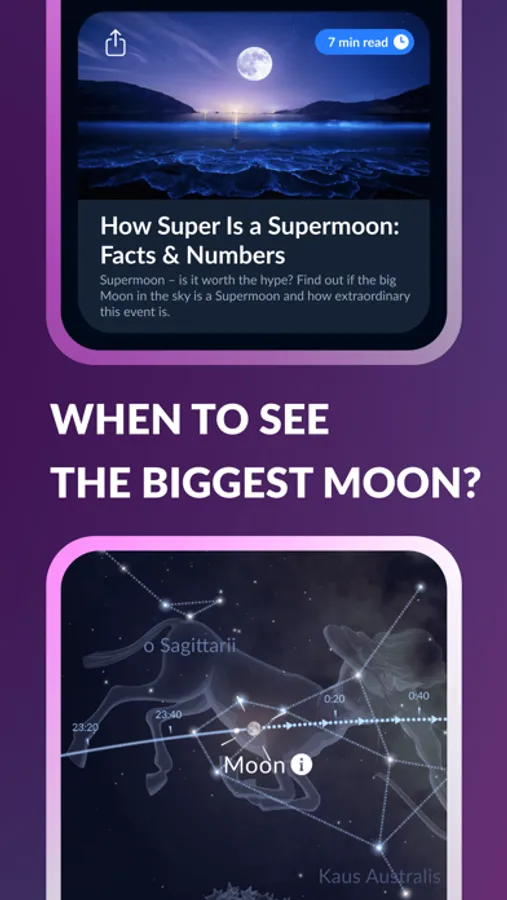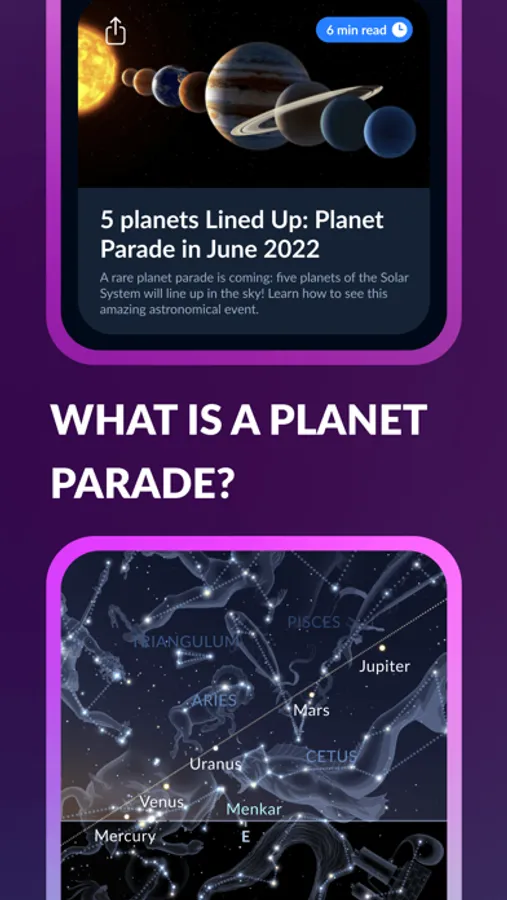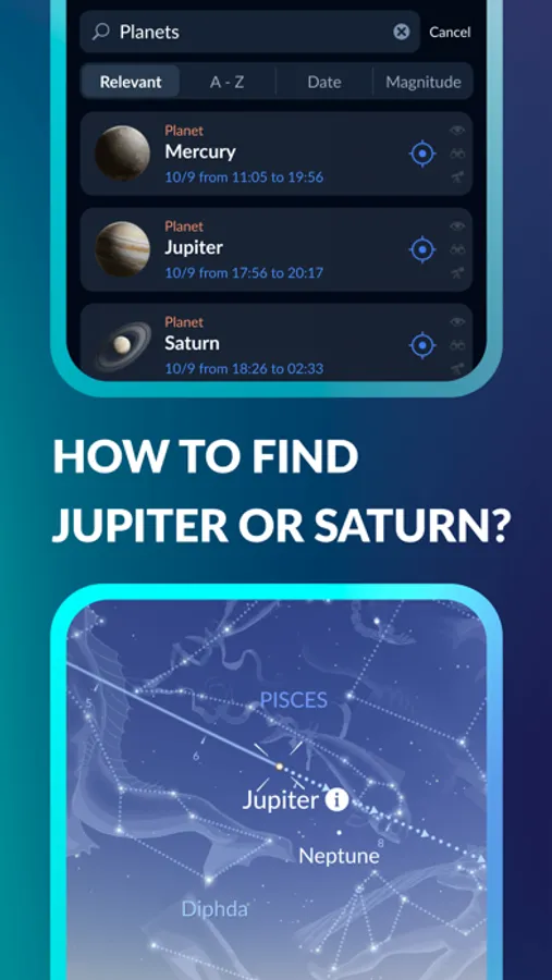 Make use of the flexible search — quickly find space objects, easily navigate across different objects and events’ types. Look for "stars", "mars moons", "mars conjunctions", "solar eclipse", and the app will show you all related objects, events, and articles!