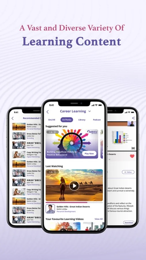 We provide nine main features: OnLive Classes, ReSkills OnDemand, On The Go, Podcasts, Special, OnFerence, OnStage, 1 On 1 and Library, each catering to a different niche of learners.