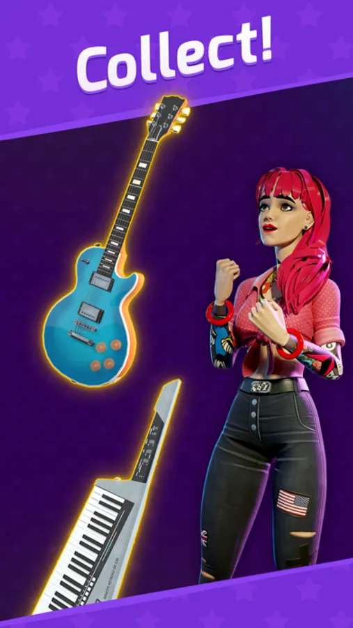 - Lots of instruments: guitars, drums, bass and more! Choose the one you like and go on stage!