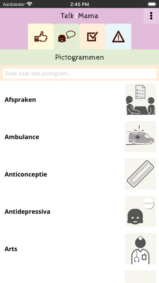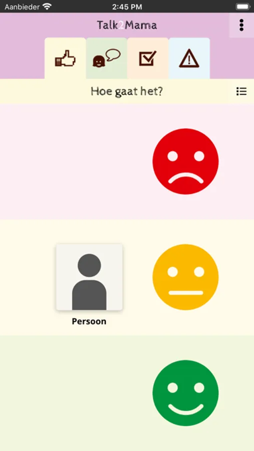 Met Talk2Mama kun je met schaalvragen, checklists en beeldverhalen duidelijk maken wat een aanstaande moeder kan verwachten tijdens zwangerschap en bevalling. Met de pictogrammen op LVB-niveau kun je zelf een beeldverhaal op maat maken voor de cliënt.