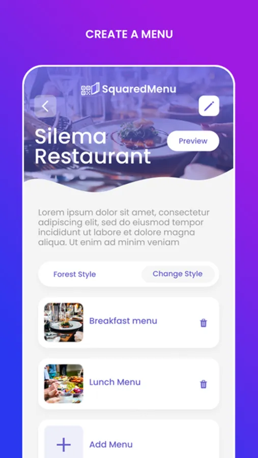 Customize Your Restaurant Menu. This QR generator is versatile and flexible – offering you the maximum degree of creativity. Change the style of your menu according to your restaurant without calling a graphic designer. With different robust styles template Squared Menu gives you the freedom to choose the right style for your business.