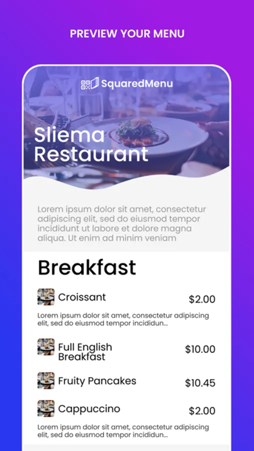 Squared Menu is a free QR code menu generator for restaurants, pubs, and bars.