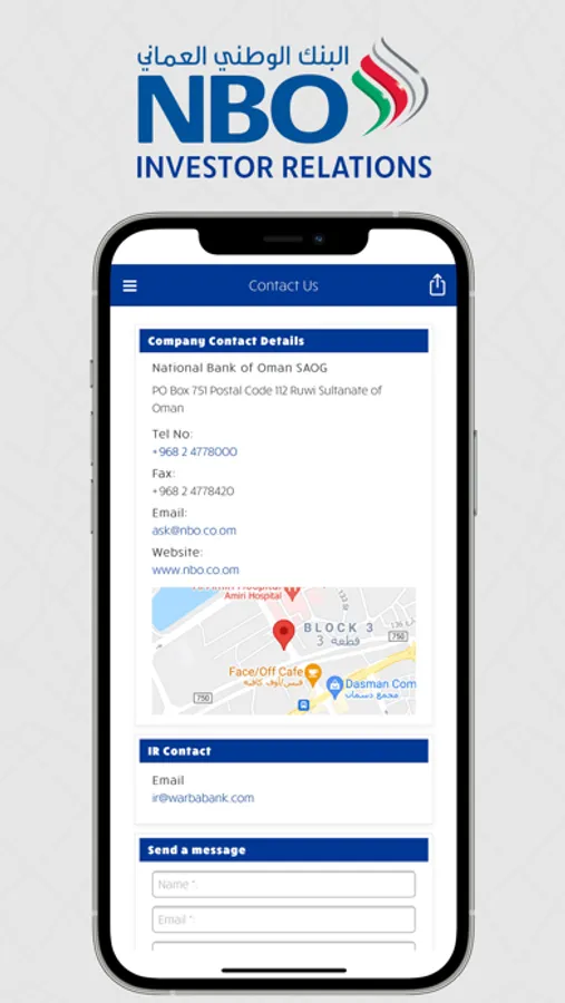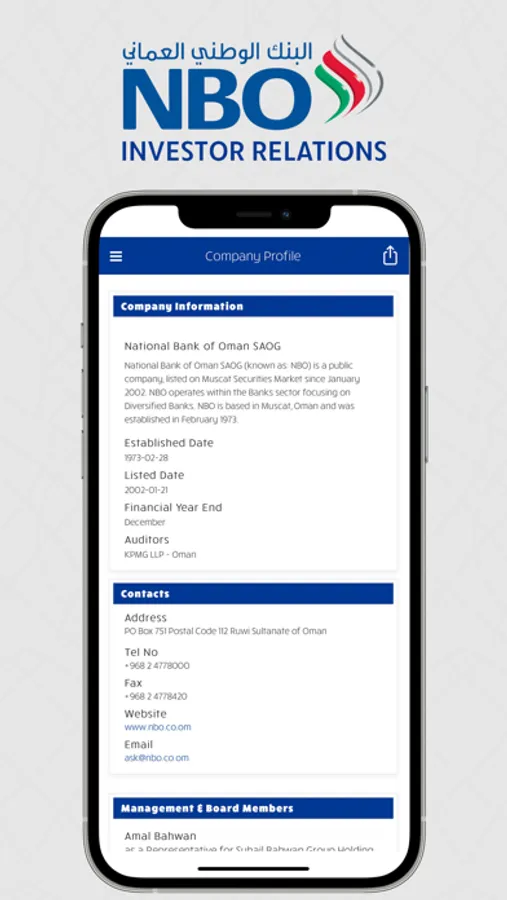 The National Bank of Oman investor relations app will keep you up to date on all the aspects of investor relations including the trading performance of the company, historical performance, company financials, key KPIs, company announcements and exchange news, IR calendar, and much more information giving a 360-degree view on the investor relations domain.