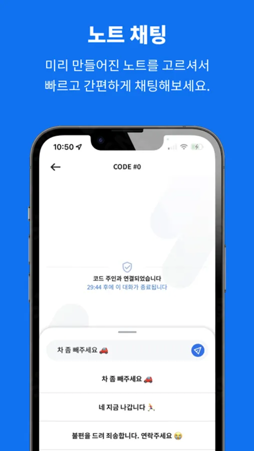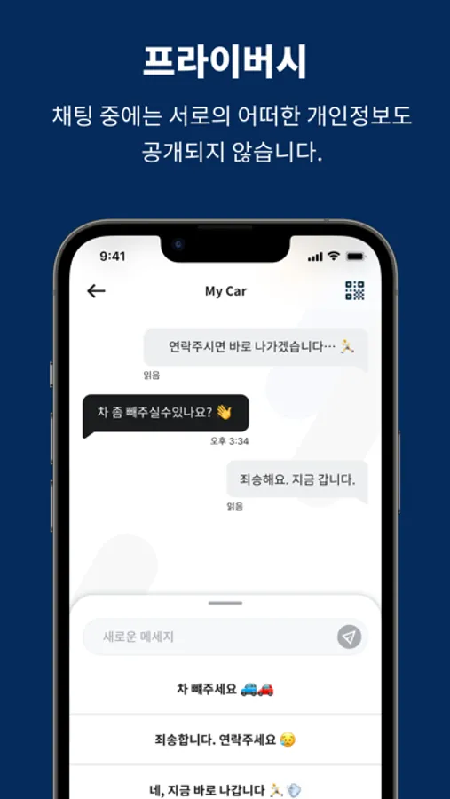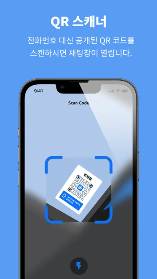 2. 전화 번호를 일일이 누를 필요없이 간단하게 QR 코드를 스캔하면 채팅이 시작됩니다. 채팅 중에는 어떠한 개인 정보도 공개되지 않습니다.