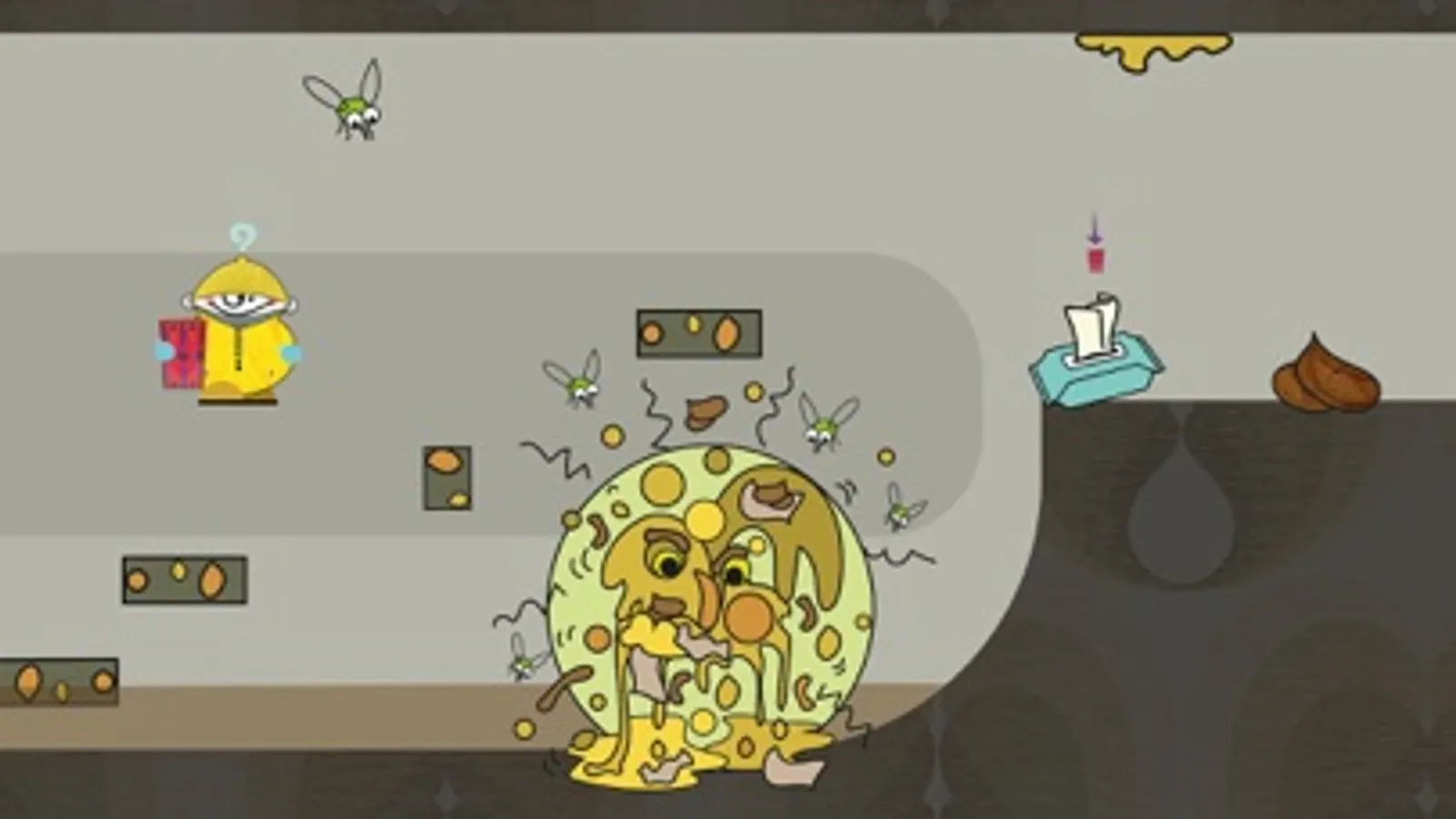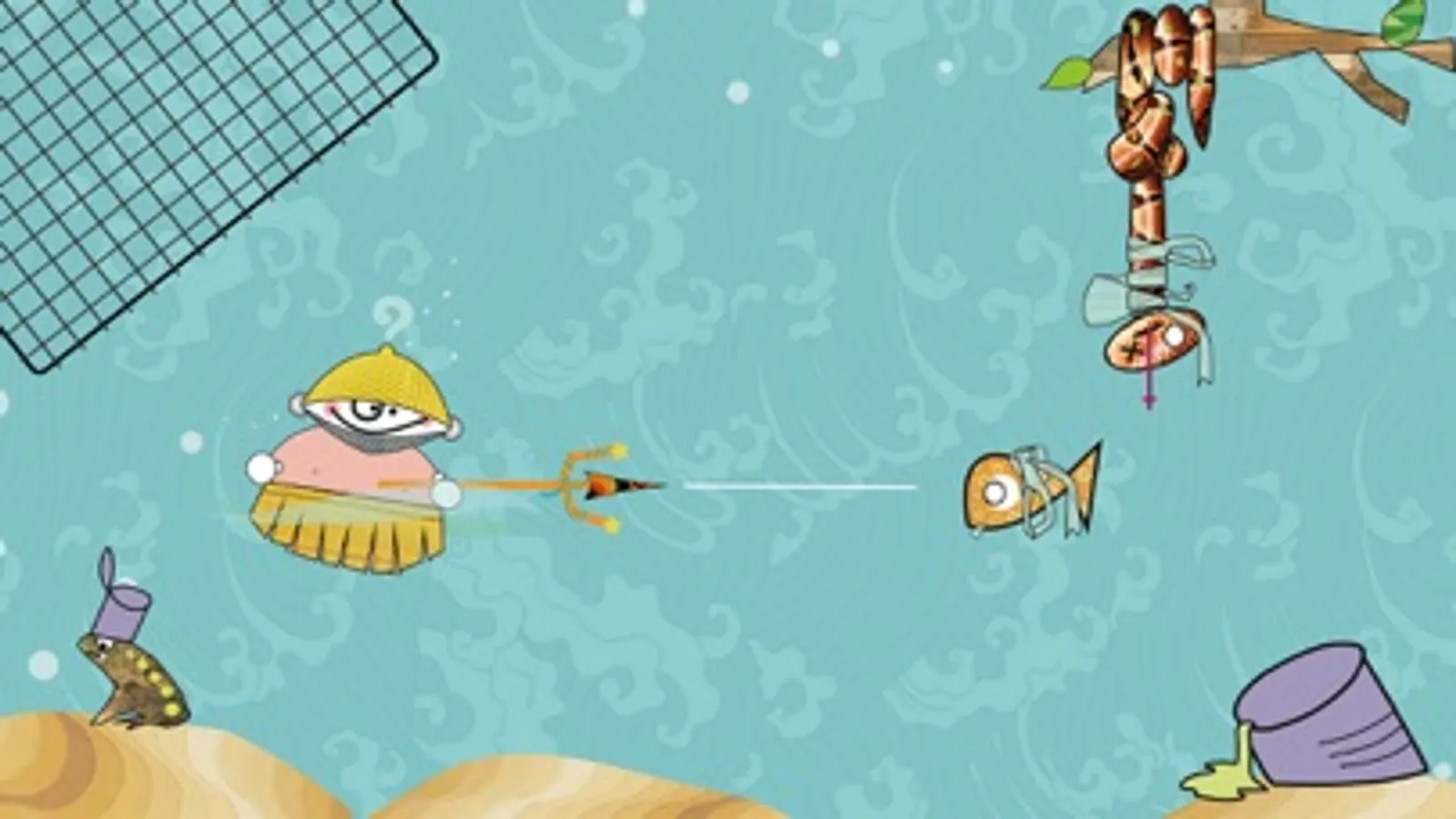 Je bestuurt Koenibald door de icoontjes in de hoeken aan te raken terwijl hij automatisch door het level loopt of zwemt.