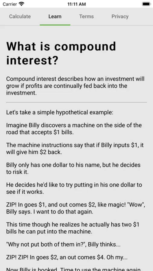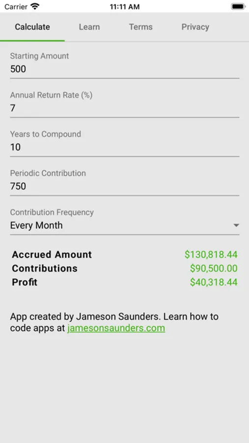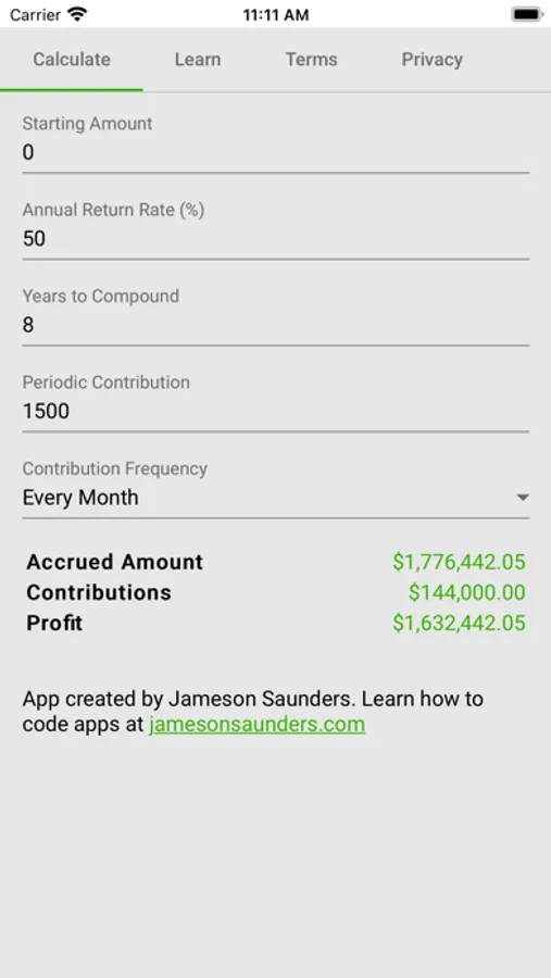 Calculate continuous compound interest for your investments. This is great for 401k earnings estimations, SMP 500 investment returns, or any investment where you know the numbers to use in the estimation.