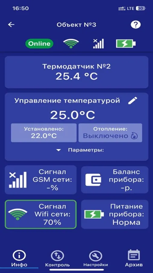 Управление приборами возможно из любой точки мира, где есть сотовая связь или интернет. Оповещения о событиях мгновенно отображаются в приложении и дублируются Push-сообщением. Приборы могут передавать данные как через мобильный интернет, так и через wifi-сеть.Один аккаунт может управлять несколькими разными устройствами.