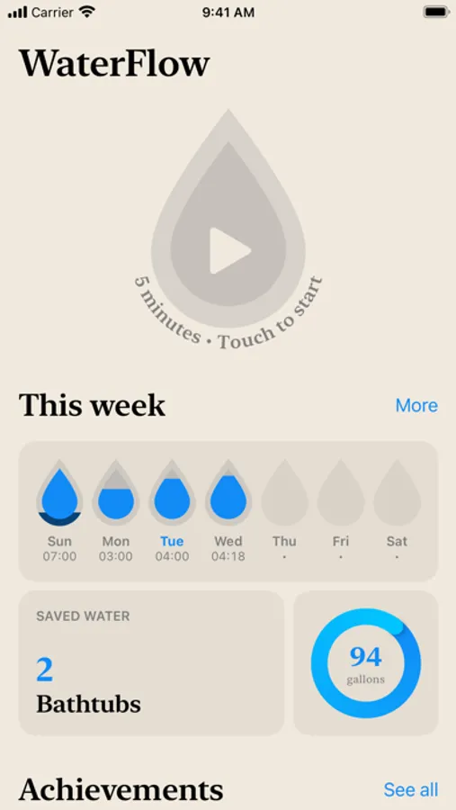 WaterFlow helps you to take 5 minutes showers and to stay motivated to reduce you water consumption.