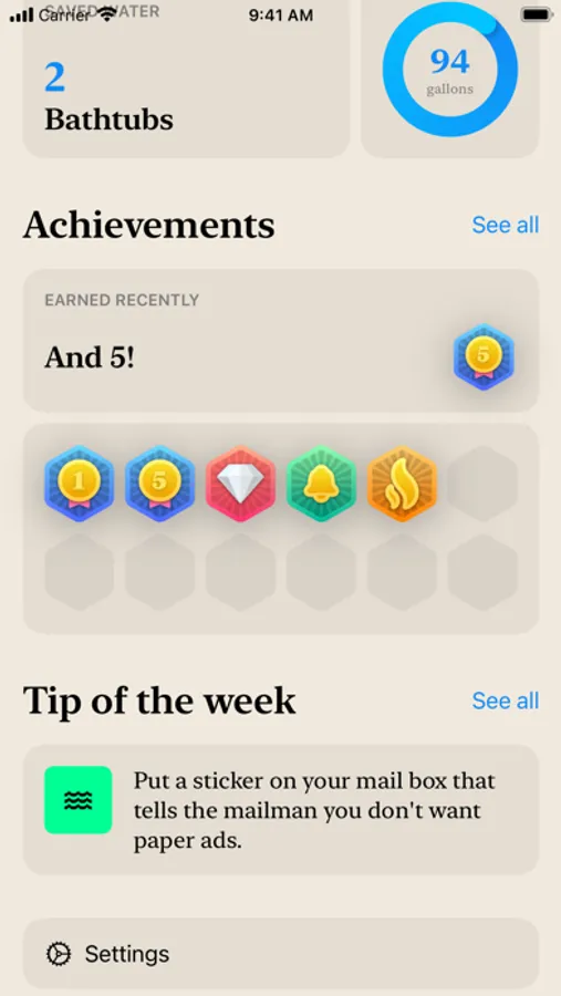 - Progress: get a clear view on your water consumption to help you reduce your shower time through weeks and months.