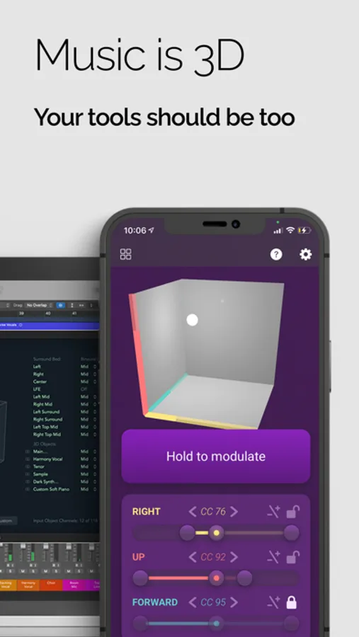 There's no one right way to play! Experiment as much as you want with Controlla XYZ to produce some truly unique sounds. And Controlla XYZ is a super intuitive and fast way to create 3D mixes of your music, placing sounds within a 3D sound space. Your music with be ready for Apple Spatial Audio and Dolby Atmos in no time.