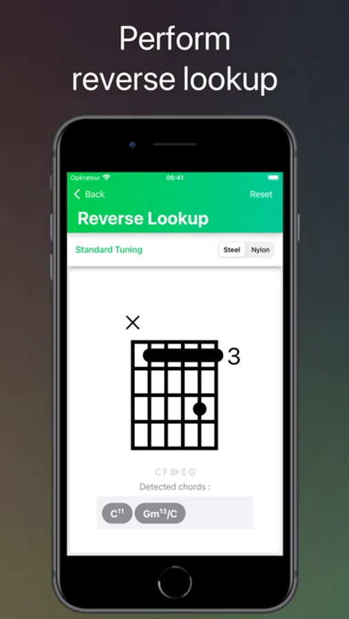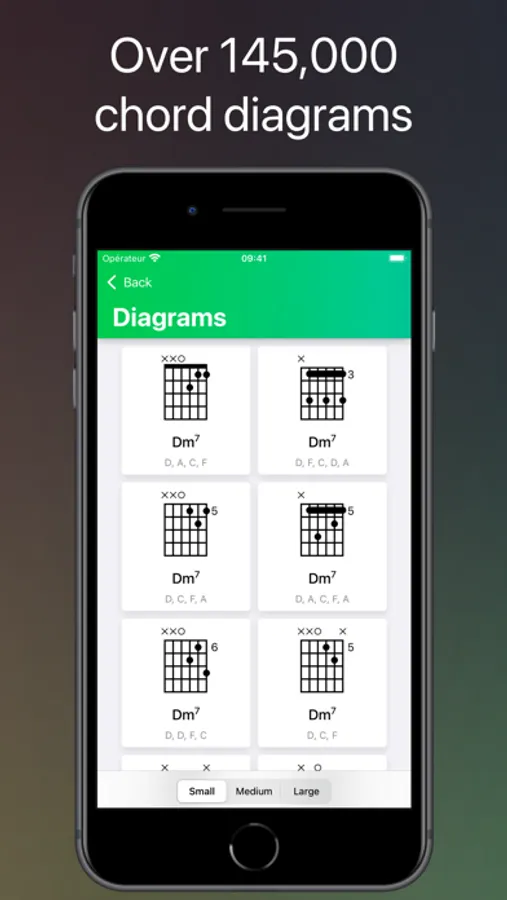 The app supports over 50 different chord types; slash chords are also supported. In total, there are over 7,500 chords.