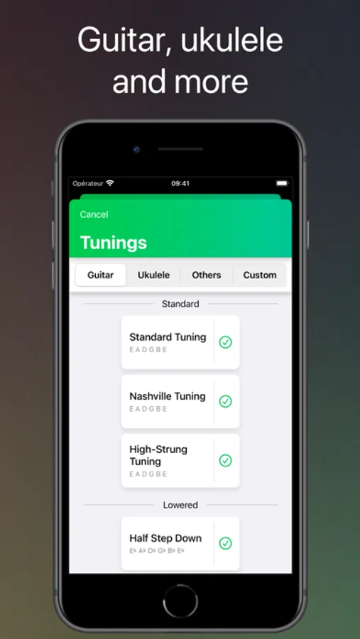 Interested in alternate tunings? You're covered. Pick your tuning from our catalog and we'll show you how to play all your chords in that particular configuration. You can also create your own custom tuning, with 3, 4, 5, 6, or 7 strings.