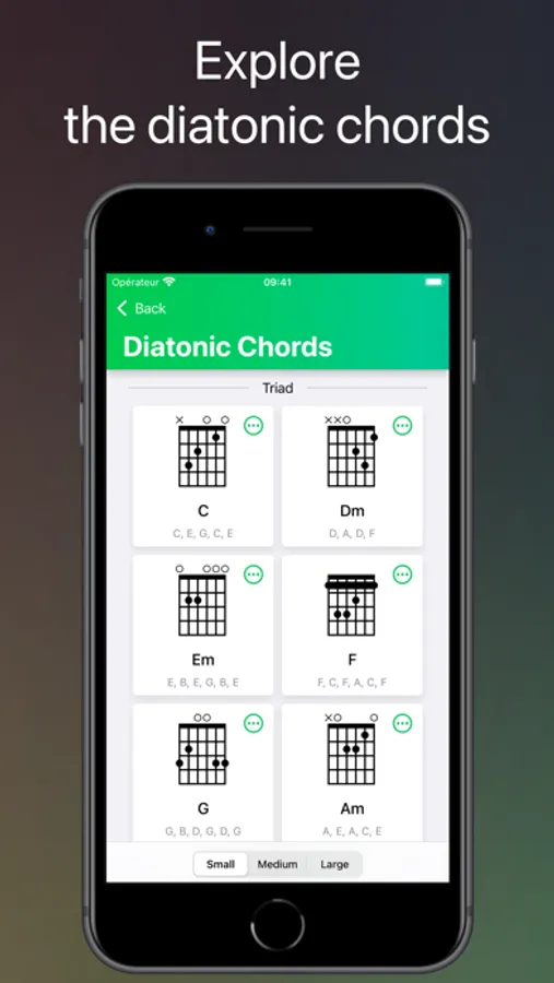 Pick the scale of your choice; the app will show you the diatonic chords for that scale.