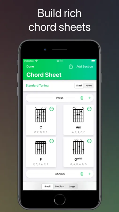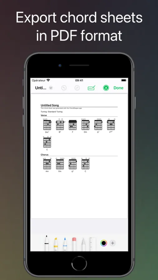Create rich chord sheets with the chords of your choice. Save your work to a file, then export your chord sheets as PDF.