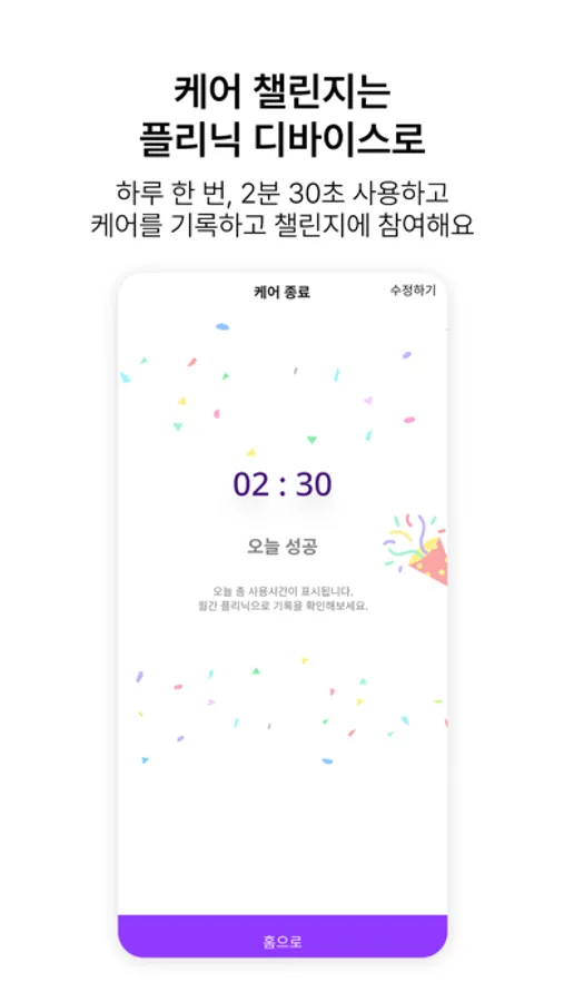 ■ 케어챌린지는 기존의 플리닉 플라즈마 디바이스와 연동하여 피부관리 시간을 체크하고 기록하며 챌린지에 도전할 수 있어요!