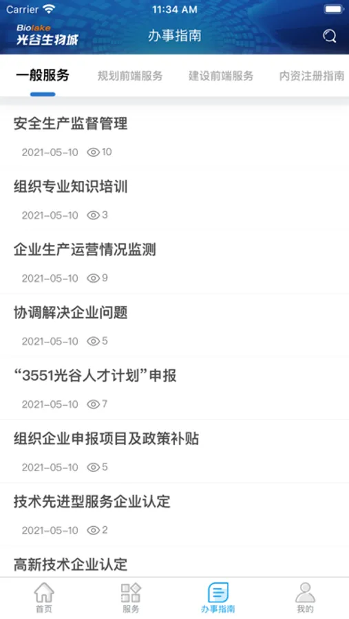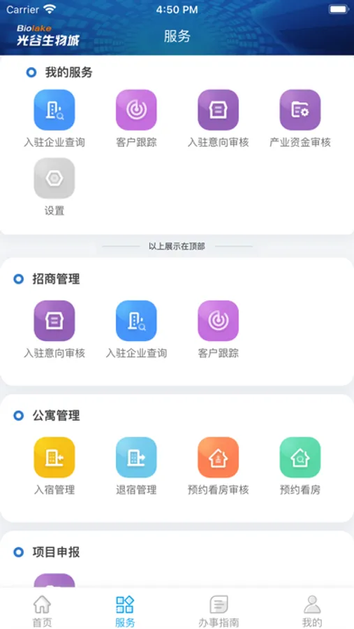 武汉光谷生物城APP平台目前提供招商管理、金融服务、项目审核、供需服务、人才服务、企业活动、会议活动、物业服务等;