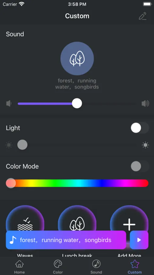 App can remotely adjust the sleep instrument to play sleep sound effects such as white noise, support XIULEMIAN multi-model selection and switching, quickly select sound source scenes, light colors, switch on and off regularly, and collect personal favorite scene modes.