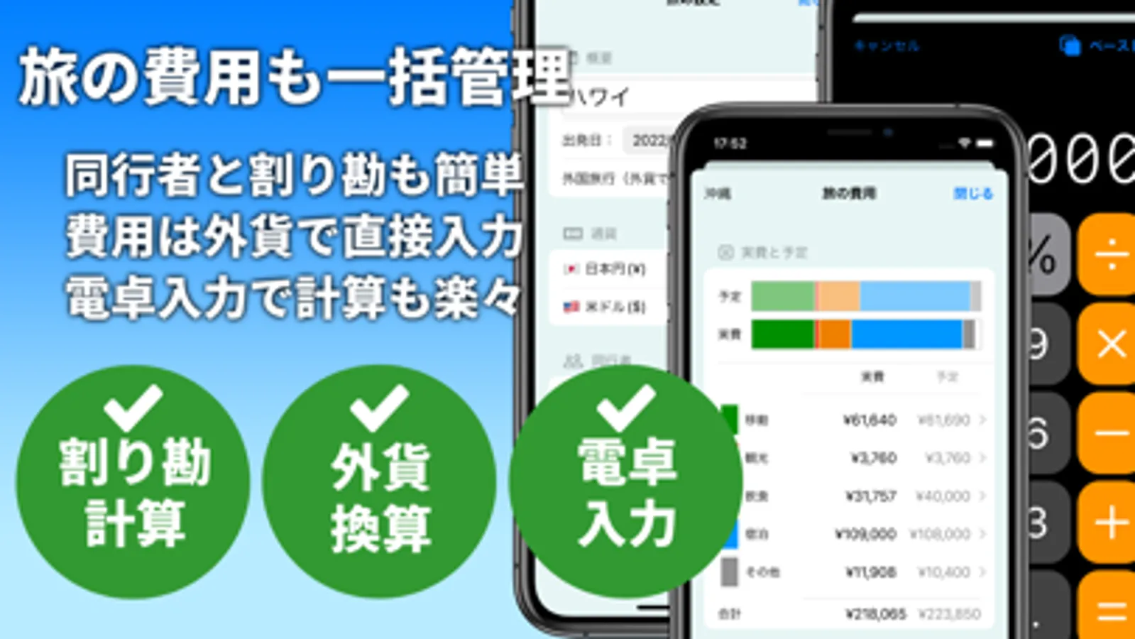 旅ごとに使用する外貨のレートを設定し、支払いごとに外貨だてで計画・記録できます。(※)
