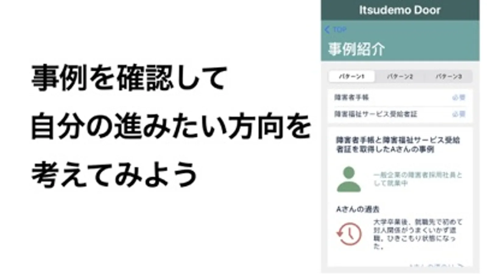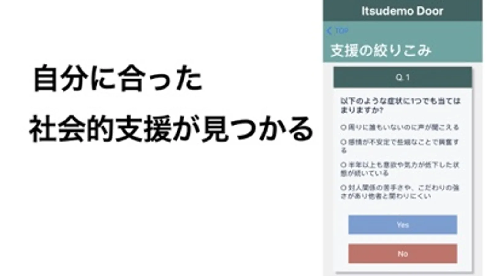 まずはこのアプリで知識を得ていただき、「1人で悩まずに誰かに相談してみよう」と思っていただくことが目的です。扉の向こう側へ踏み出すきっかけとしてぜひご活用ください。