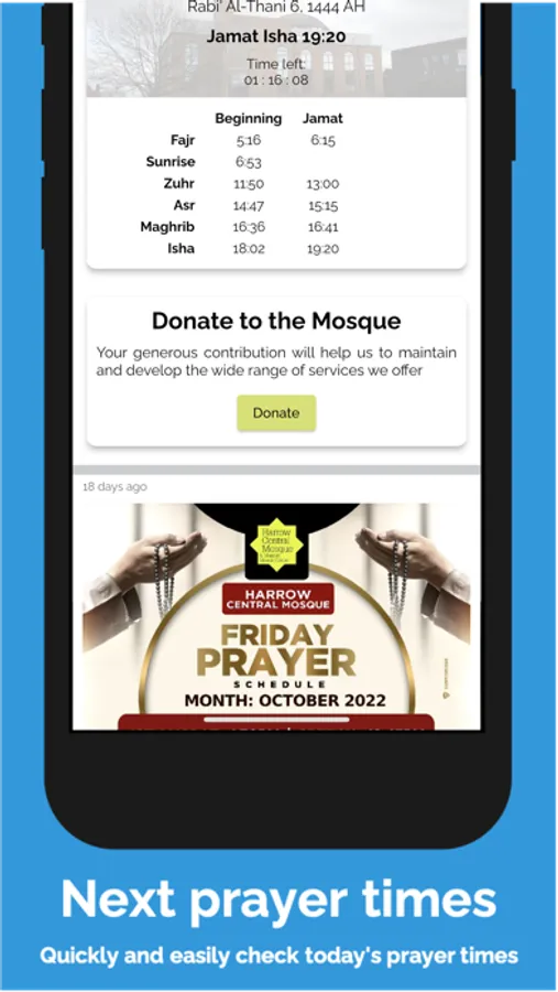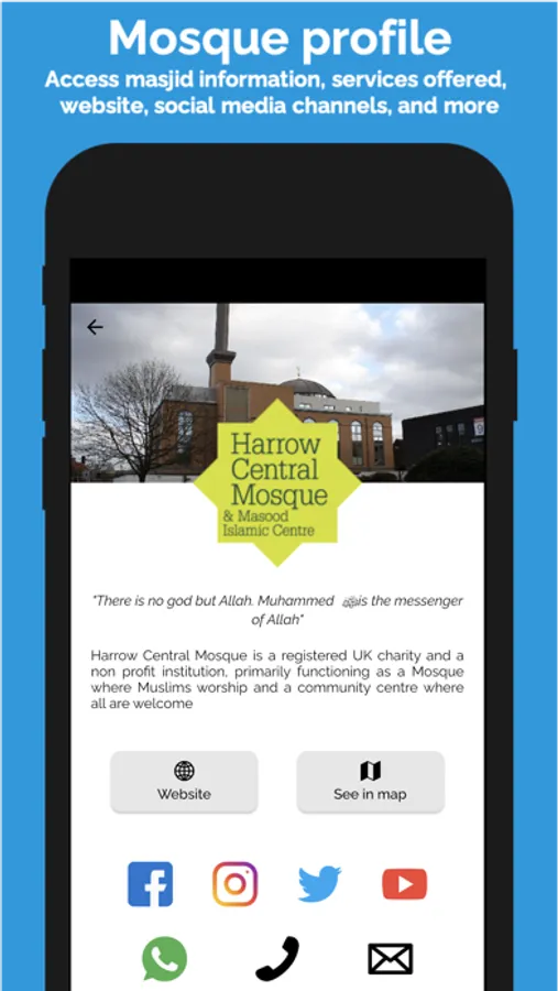 - Access your mosque information, services offered, website, social media and more