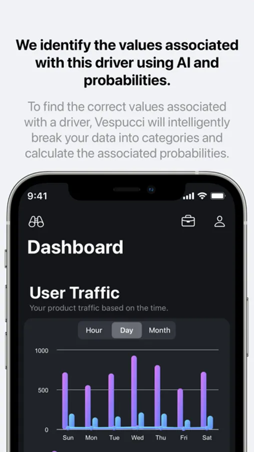 -Find what you forgot to look for. Most analytics tools ask you to specify what you’re looking for, not Vespucci. Vespucci is designed around models that highlight for you the drivers of remarkable user behavior.