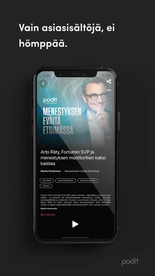 Pysy ajan hermoilla ja kehitä itseäsi. Podit® kokoaa business- ja asiapodcastit sekä äänikirjat yhden palvelun alle ja tarjoaa eksklusiivisia, eturivin business-ihmisten toimittamia Podit Originals® -podcasteja.
