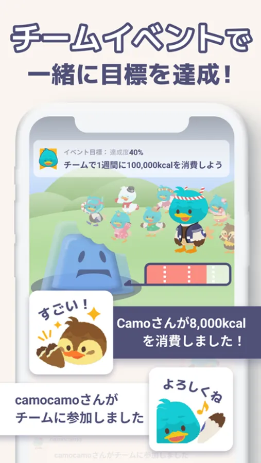 【カラダモ】は、月に1回のイベントを通じ、チームの仲間と同じ目標に向けて記録を続けることで、ダイエットの継続をサポートするアプリです。