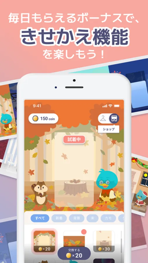 毎日こつこつ頑張って、目標に到達すると、スペシャルな「きせかえ」アイテムやコインを獲得!