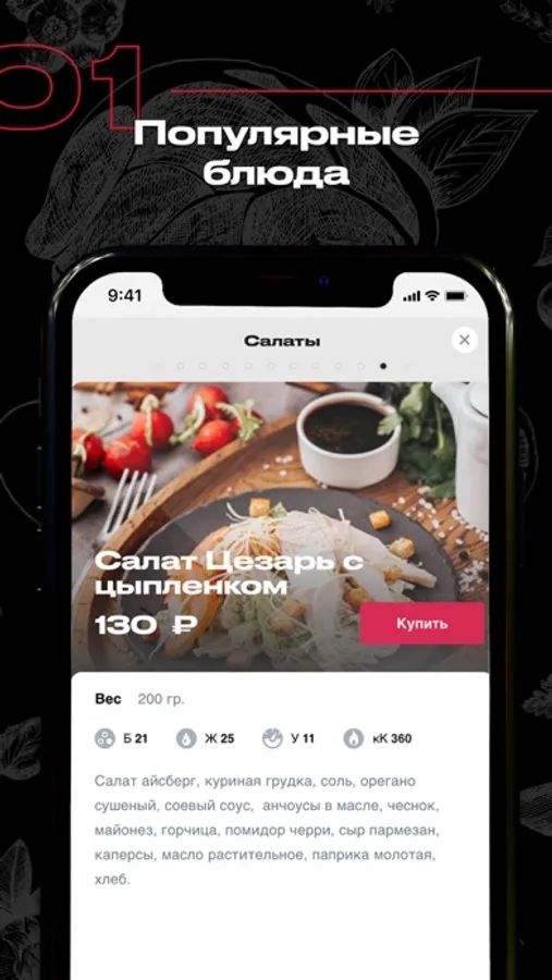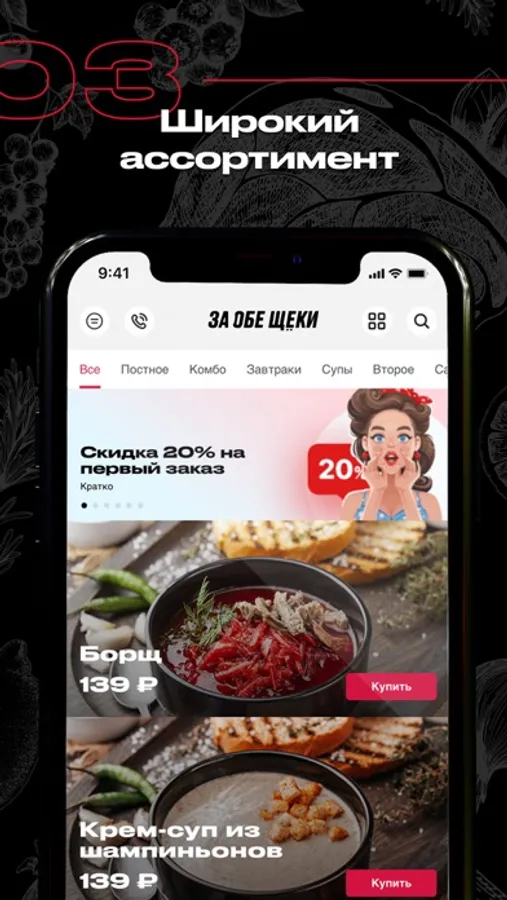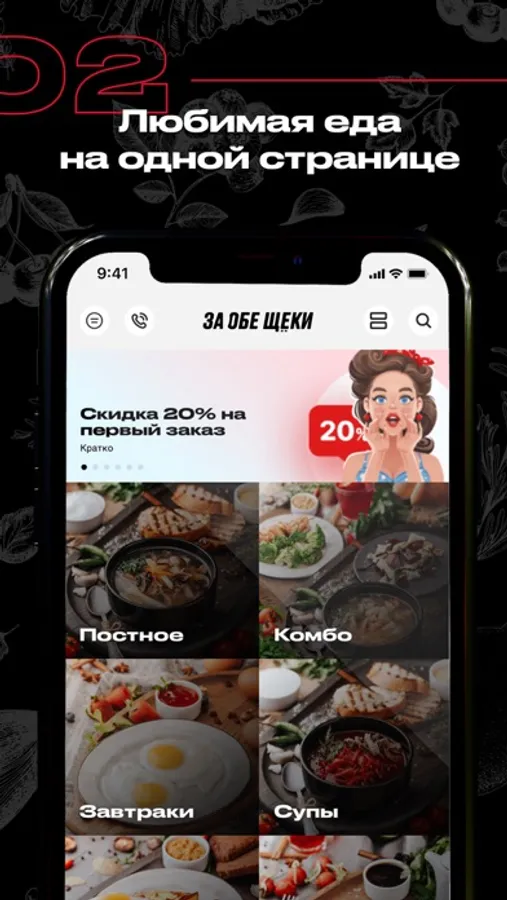 В За Обе Щёки можно заказать обед в офис, накрыть праздничный стол или накормить вкусным ужином всю семью абсолютно не тратя время на готовку и поиск рецептов. Наш шеф-повар со своей командой профессиональных поваров разработали разнообразное меню, которое постоянно обновляется. А для вашего удобства в приложении все меню разделено по категориям: супы, завтраки, закуски, салаты, горячее, гарниры, выпечка.