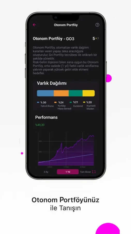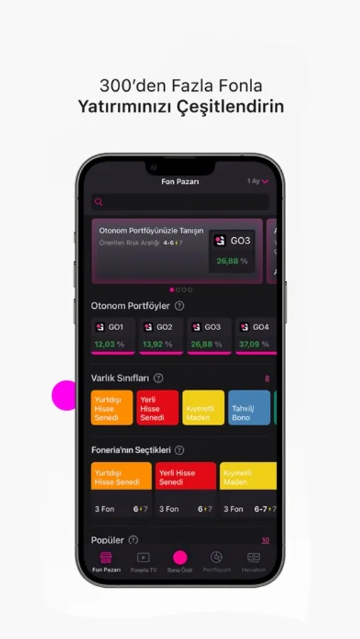 “Otonom Portföy”ler farklı varlık sınıflarındaki fonlar ile oluşturulmuş portföylerdir. Foneria Portföy Yönetimi A.Ş. tarafından farklı risk değerlerine sahip yatırım fonları şeklinde kurulmuştur. Otonom Portföy varlık dağılımı, Foneria Portföy Yönetimi A.Ş.’nin uzman fon yöneticileri tarafından oluşturulan bir algoritma ile düzenlenir. Bu sayede “Otonom Portföyler”, piyasa gelişmelerine uygun olarak güncellenir.