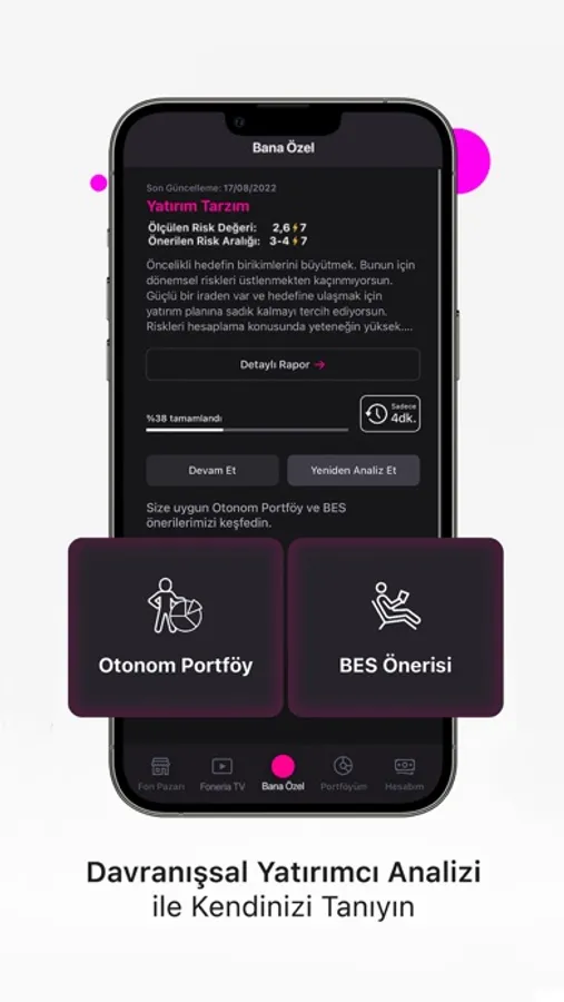 Hepimizin yatırım yaklaşımı ve hedefleri farklı. Doğru yatırım kararlarını vermenize yardımcı olmak için Davranışsal Yatırımcı Analizi’ni geliştirdik. Foneria Davranışsal Yatırımcı Analizi ile yatırım yönelimlerinizi ve risk toleransınızı öğrenebilirsiniz.