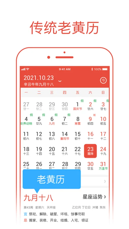 万年历黄历:拥有完整的老黄历信息,详细罗列出农历节气变化,每日宜忌,吉神凶神,天干五行,同时显示公历、农历和干支历等多套历法。