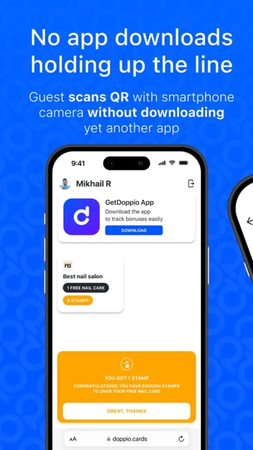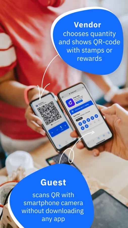 Simply use your phone or POS device to generate a doppio QR code, and have your guests scan this code to collect stamps. They don't need to download the app, as any web browser and smartphone camera will work. When a guest has enough stamps for a reward, they scan the reward QR code.
