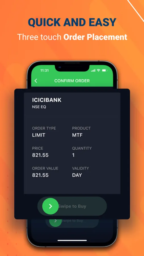 Quick Order Placement: Place buy and sell orders with a swipe, the perfect 3 touch order experience.
