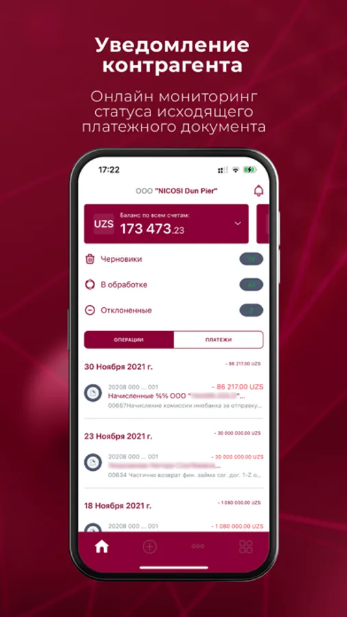 - Уведомление контрагента (sms, email) о статусе исходящего платежного документа;