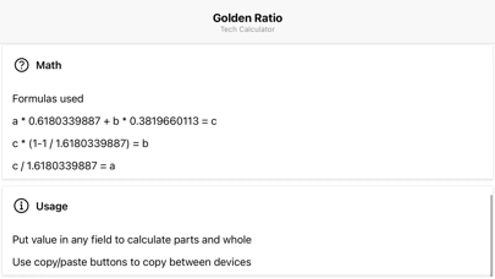 - Have golden ratio coefficients ready to be copied from the app to your workflow!