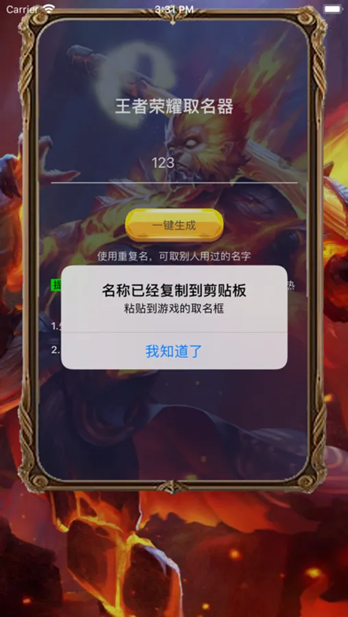 王者荣耀取名器是一款工具APP,为玩家提供修改名称服务,用户只需要在文本框中输入想要的昵称,点击生成重复名即可将昵称复制到剪贴板。