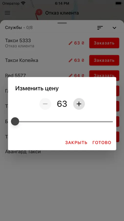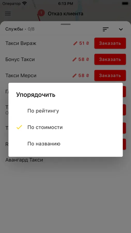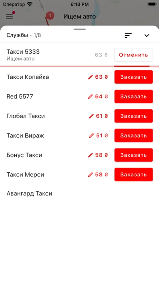 После расчета стоимости возле каждой службы появляется кнопка "Заказать" или "Отменить" в зависимости от состояния заказа. Таким образом, есть возможность одновременно управлять необходимым количеством заказов, что позволяет находить машину максимально быстро по оптимальной стоимости.