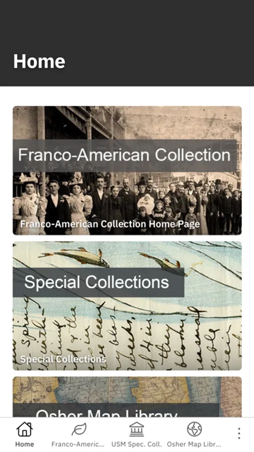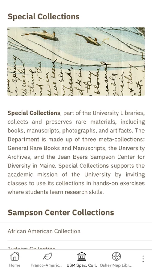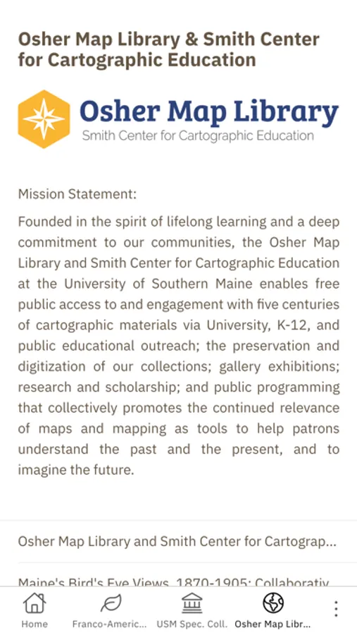 This app is a joint effort of the University of Southern Maine's (USM) three special collections libraries: The Franco-American Collection, the Osher Map Library, and the USM Special Collections, including the Jean Byers Sampson Center for Diversity in Maine. The app includes virtual exhibits, walking tours, collections information, and contact information for each library. Learn more about our rich and diverse collections with one click!