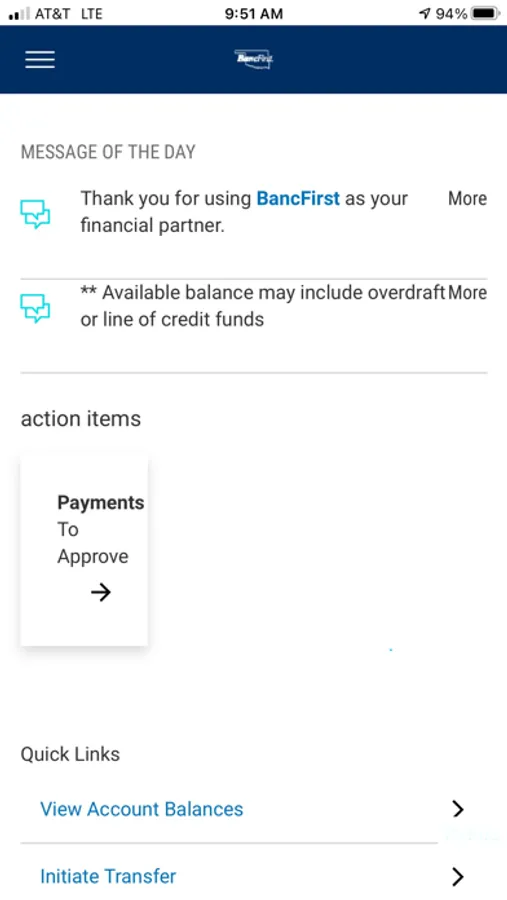 The BancFirst Business Mobile app is free, but web connectivity and usage rates may apply. To use BancFirst’s Business Mobile Banking you must first be enrolled and have logged on to BancFirst’s Business Online Banking with your PC. If you haven’t signed up for BancFirst’s Business Online Banking, contact your Treasury Management Officer at your nearest banking location for information regarding our Treasury Management services.
