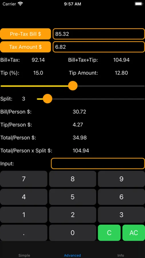Easy to use tip/gratuity calculator. Has two modes: Simple and Advanced. In the Simple mode, just input your pre-tax bill, set your tip percentage (defaults to 15%), and instantly get your tip amount.
