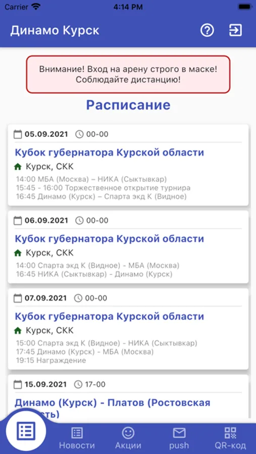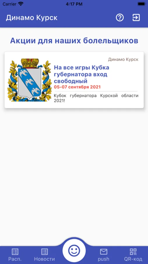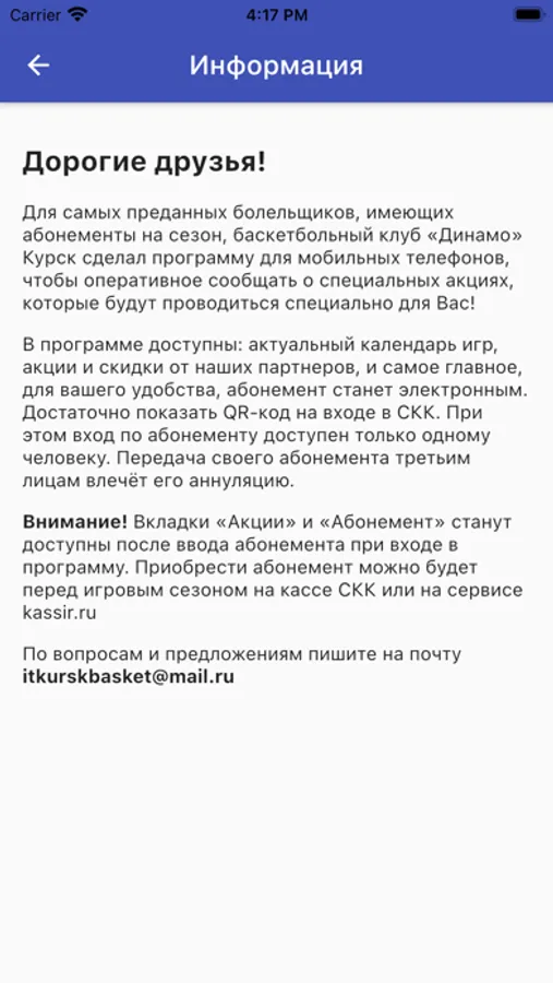 Вкладки «Акции» и «Абонемент» станут доступны после ввода абонемента при входе в программу. Приобрести абонемент можно будет перед игровым сезоном на кассе СКК или на сервисе kassir.ru