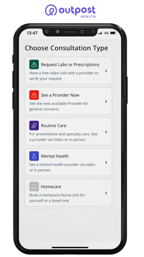 At Outpost Health, we use technology to humanize healthcare. The Outpost Health app connects you via video or chat to a team of medical professionals — doctors, nurses, pharmacists, psychologists, nutritionists and wellness coaches.