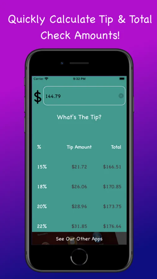 quickly enter the bill amount and we calculate based on common percentages, to provide you with the tip and total amounts, making figuring out the tip painless.