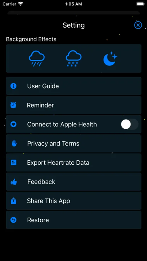6. On the "Setting" page, you can set the functions of syncing your heart rate to "Apple Health", modifying the dynamic background, exporting data, setting reminders, etc.
