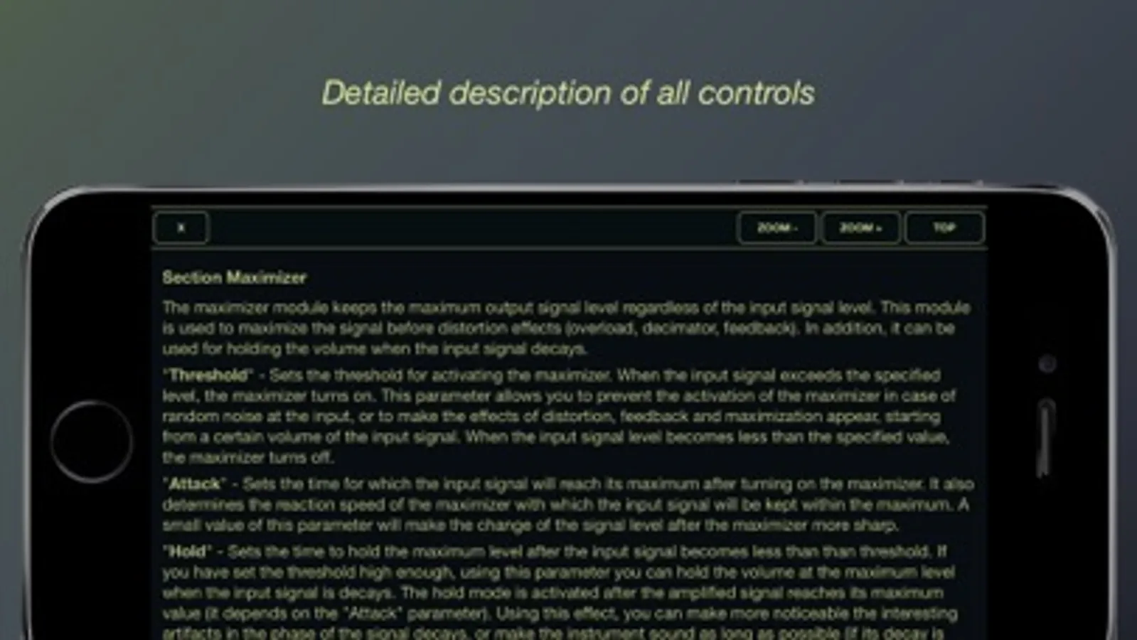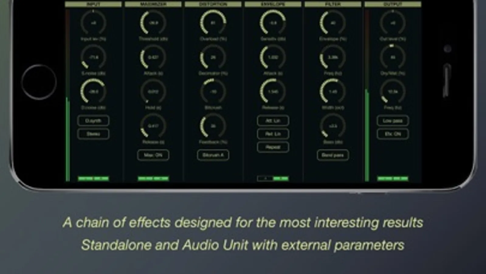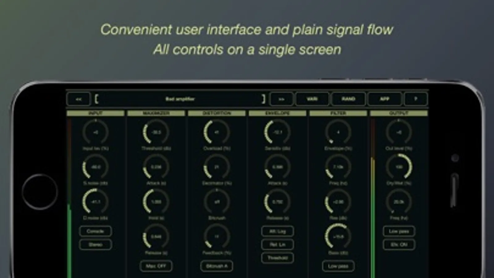 All controls are located on a single screen, grouped by function into six sections with a plain way of signal path from the first section "Input" to the last section "Output". The chain of individual effects in this app is designed in such a way as to get the most interesting result for any parameter values in the widest possible range.