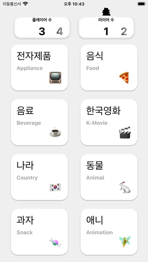 1. 플레이어/라이어 수를 선택하고 카테고리를 고릅니다.